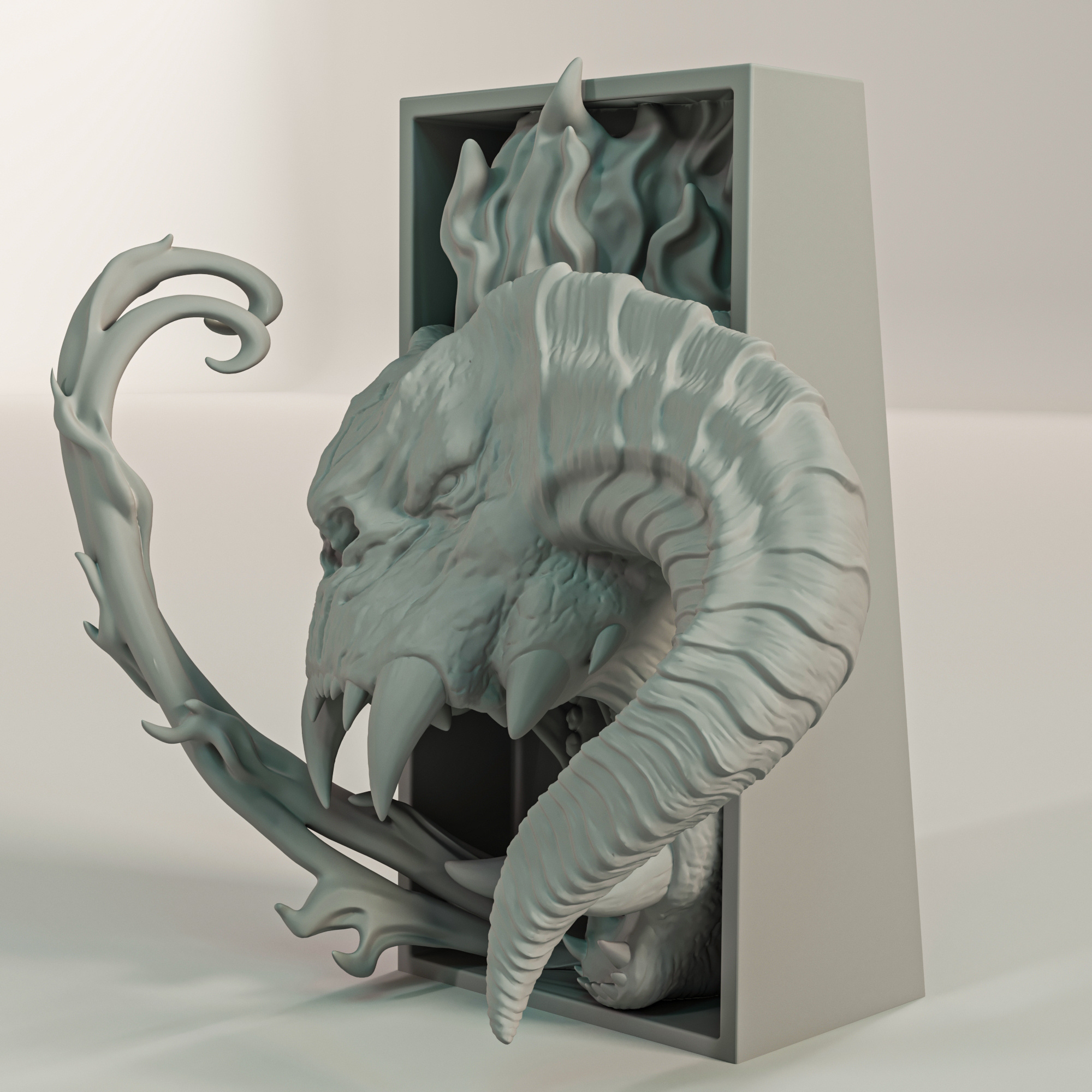 W tej monumentalnej podpórce do książek, jego groźna, demoniczna głowa jest uwięziona, lecz wciąż pulsująca mocą. Z ramy wychodzi gigantyczny, spiralny róg, a pod nim kły Balroga wykrzywiają się w wyjącym, wściekłym grymasie. Z boku rzeźby wychodzi stylizowany, płomienny rzemień jego bicza, uchwycony w momencie, gdy zastygł w kamieniu jako symbol nieugiętej mocy. Powierzchnia jest szorstka i surowa, jakby wyrwana ze skał Morii.