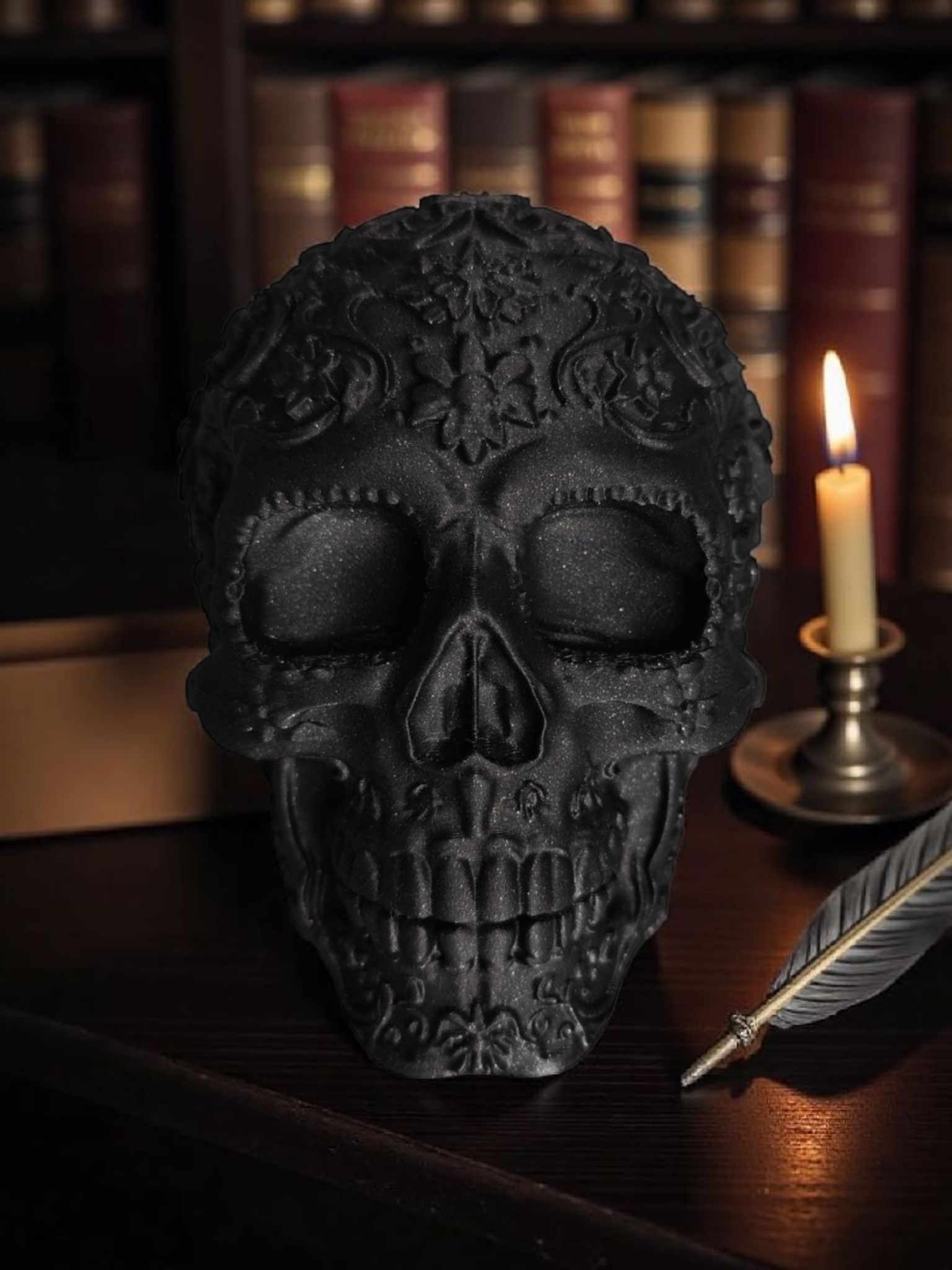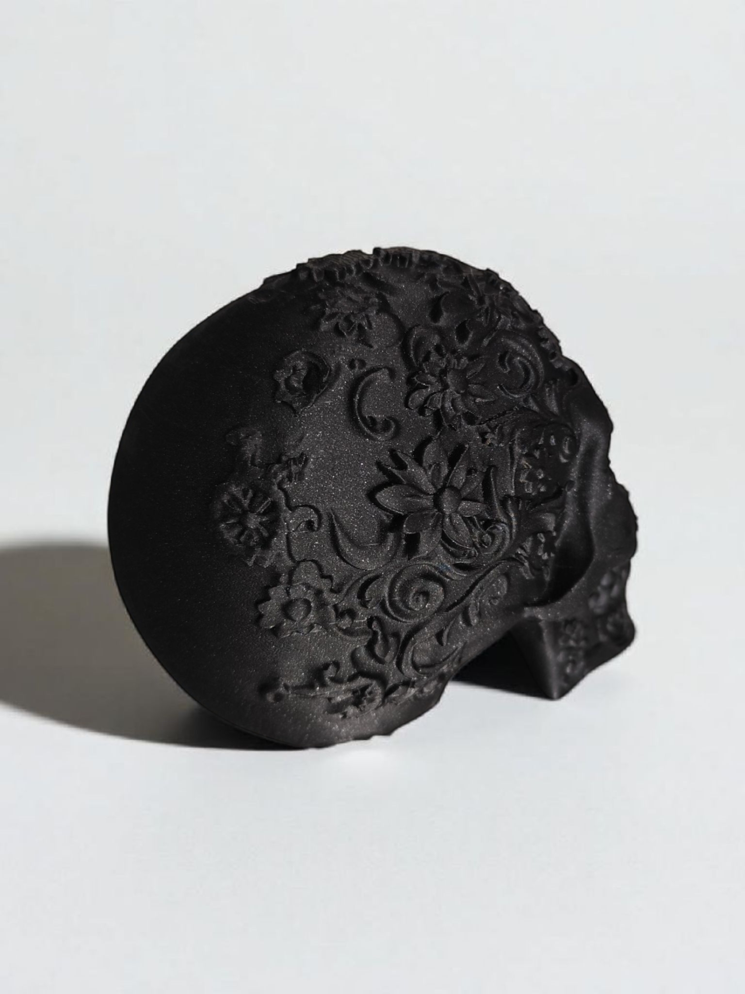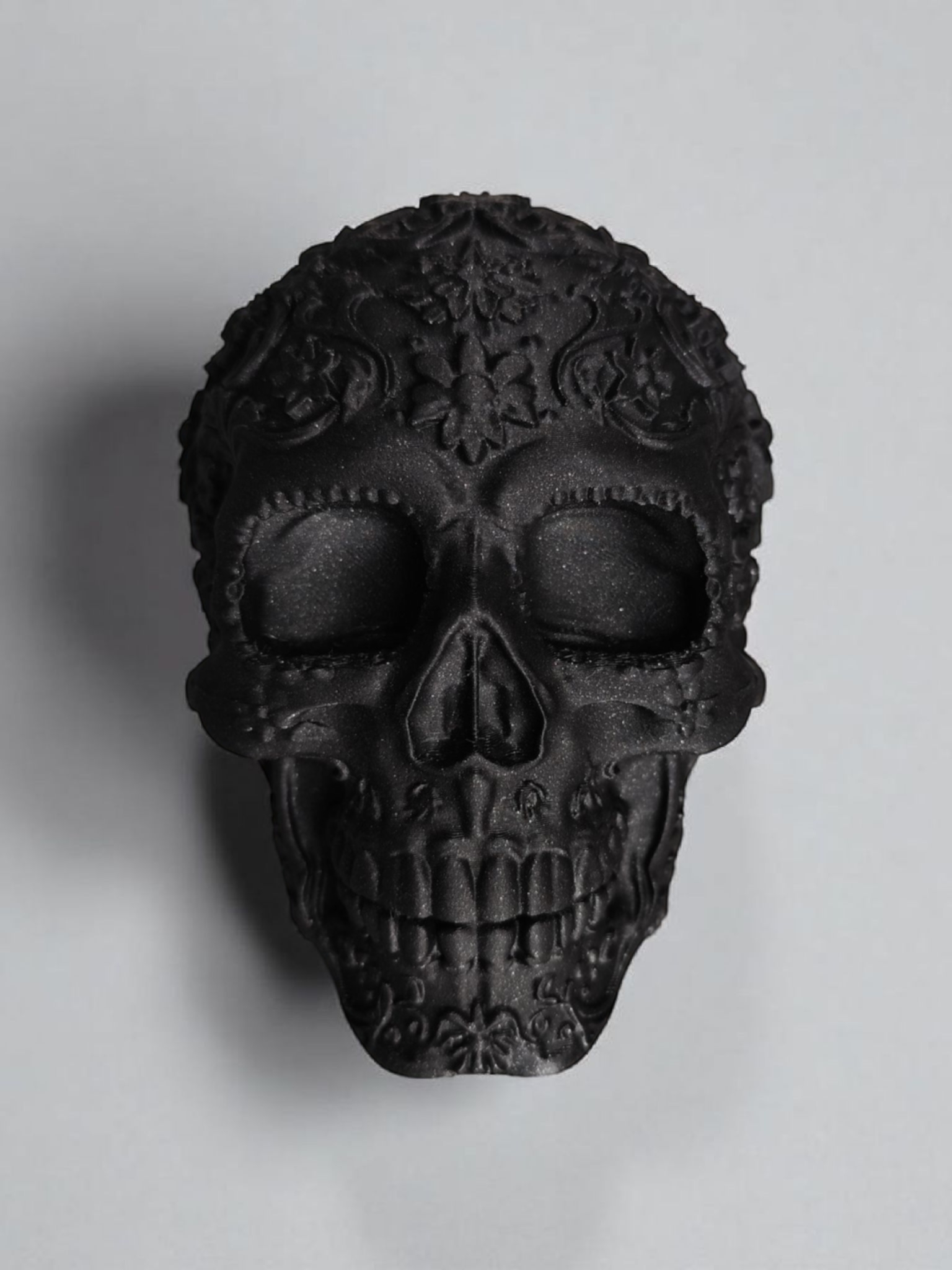 Ta imponująca dekoracja to hołd dla bogatej kultury meksykańskiego Día de Muertos, przetłumaczony na język nowoczesnej estetyki. Wykonana w głębokiej czerni z misternymi, florystycznymi zdobieniami, które pokrywają całą jej powierzchnię, tworzy fascynującą grę światła i cienia. Każdy szczegół rzeźbienia jest perfekcyjnie wykończony, nadając czaszce trójwymiarową głębię i teksturę. To idealny element do wnętrz w stylu boho, gotyckim, eklektycznym lub dla każdego, kto pragnie dodać odważny i artystyczny akcent do swojej przestrzeni.