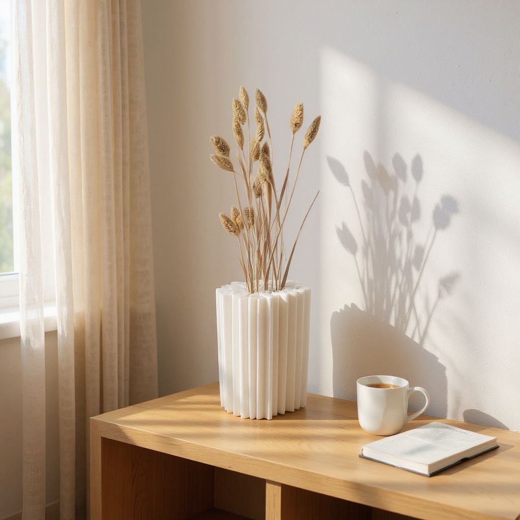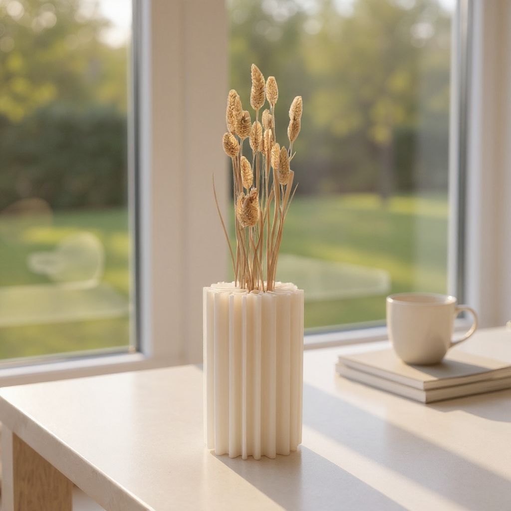 Ten unikatowy wazon to kwintesencja stylu Japandi i Soft Minimalismu. Jego cylindryczny kształt został wzbogacony o wyraźną, pionową fakturę, która wizualnie przypomina prążkowaną strukturę organicznego koralowca lub żebrowanie muszli. Zaprojektowany z myślą o suszonych kompozycjach (jak np. widoczne na zdjęciu zboża lub trawy pampasowe), zapewnia im solidną, ale jednocześnie lekką i eteryczną oprawę. Jest to must-have dla każdego, kto ceni sobie teksturę i spokój w dekoracji.