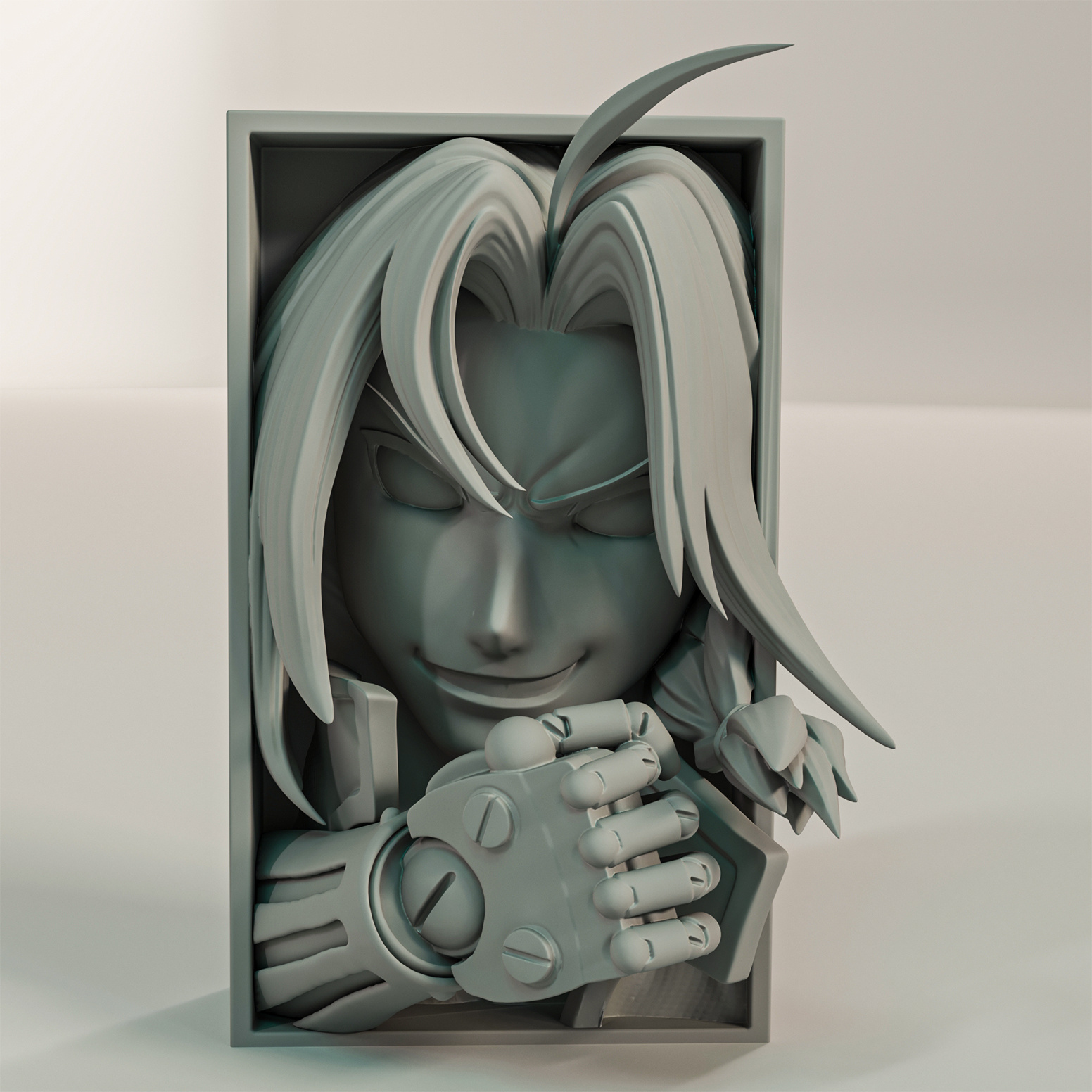 W tej niezwykłej podpórce uchwycono sekundę przed cudem: jego metalowa, masywna ręka Automail jest złożona z drugą, w symbolicznym geście transmutacji bez okręgu. Mechaniczne palce, połączone śrubami i płytkami, symbolizują straty i nieugiętą wolę ignorowania limitów. Na twarzy maluje się zuchwały, pewny siebie uśmiech, typowy dla geniusza, który właśnie rozgryzł naturę materii.