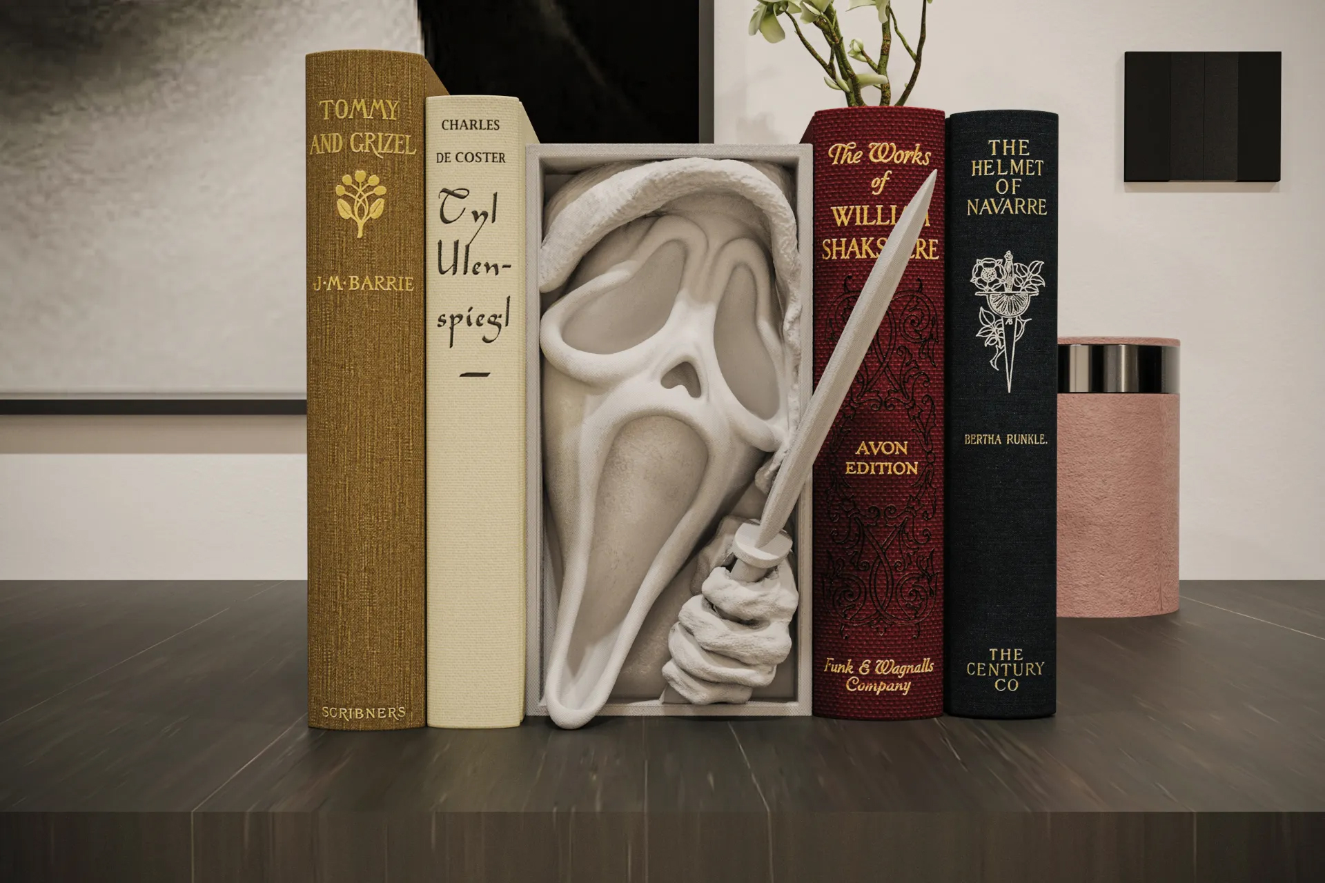 Ta podpórka to bezlitosny strażnik horroru, który wprowadza na półkę atmosferę niepokoju i podejrzliwości. Ustawiony obok Twoich tomów, wydaje się śledzić każdy ruch, a każda książka staje się elementem scenografii w ostatnim akcie slashera. Maska z nożem nie tylko podtrzymuje, ale również rozdziela opowieści, oddzielając światło od ciemności, pewność od histerii.