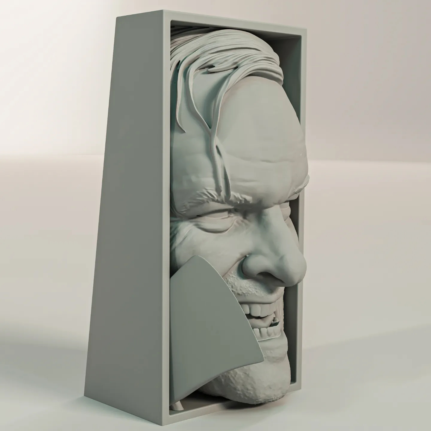 W tej dramatycznej podpórce, oblicze Jacka zostało ujęte z przerażającą precyzją: jego mania jest uwięziona, lecz wciąż żywa. Szeroki, szaleńczy uśmiech, wykrzywiony w niemym krzyku, i przymknięte oczy emanują czystym, nieokiełznanym obłędem. Z boku rzeźby, w cieniu, złowieszcze ostrze zdaje się czaić, symbolizując niszczycielską siłę, która czeka, by rozerwać ciszę.