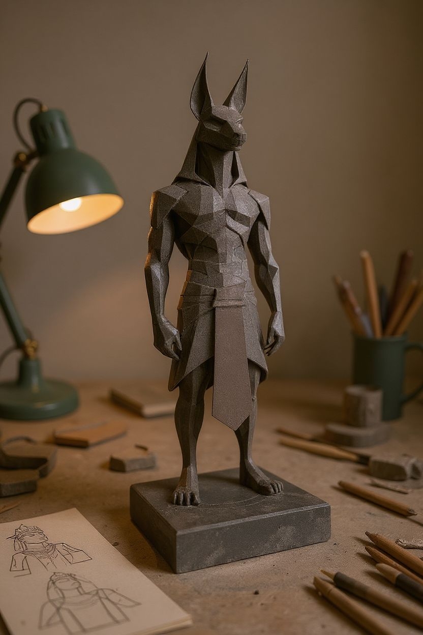 - Wyraźna Dbałość o Detale Formy: → Mimo geometrycznej uproszczenia, rzeźba wiernie oddaje posturę Anubisa i egipski strój, zachowując jego majestatyczny charakter.