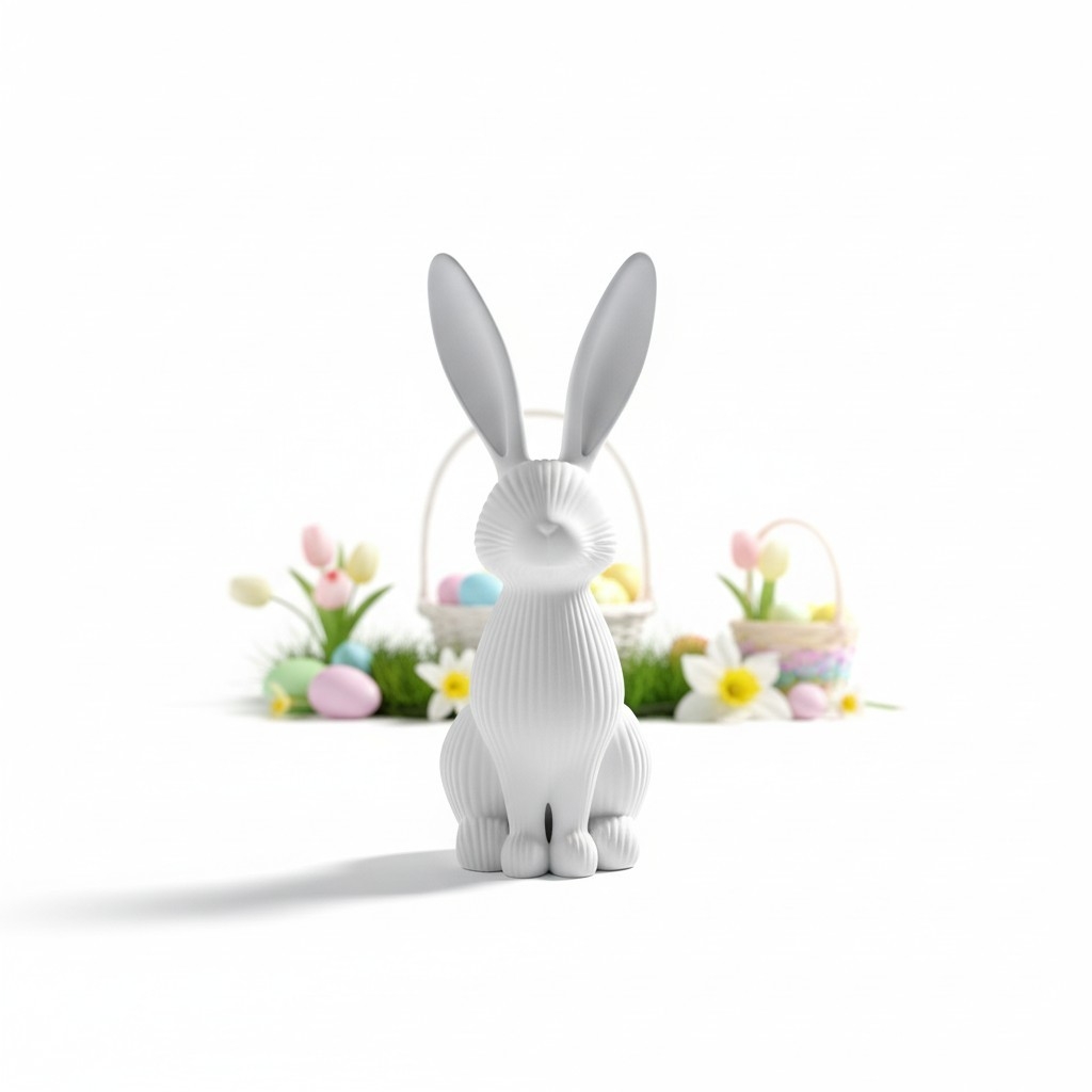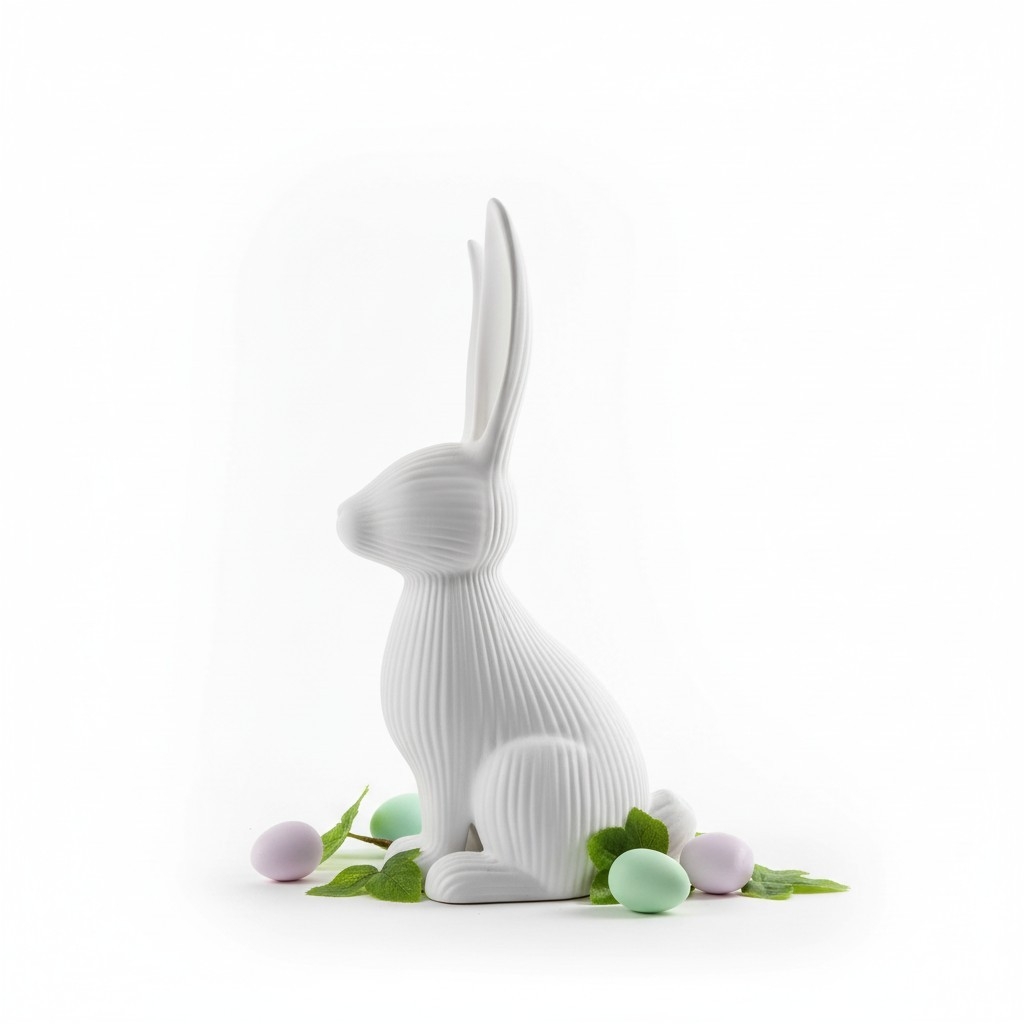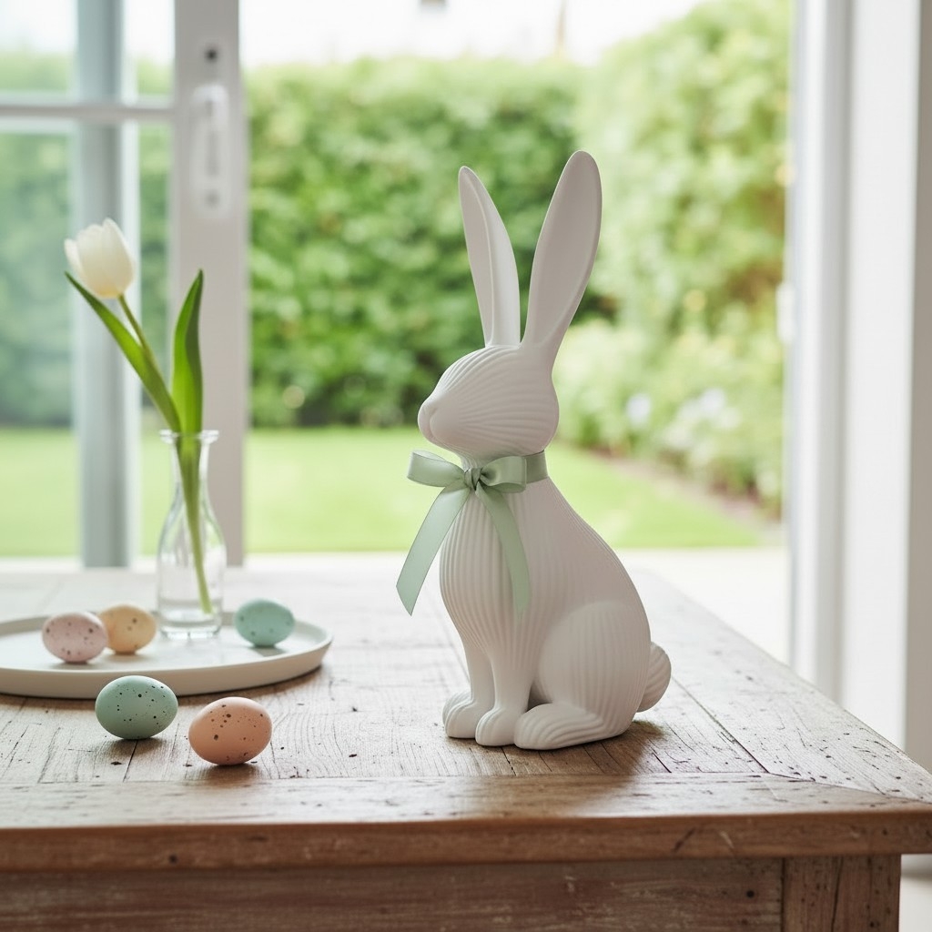- Unikalna żebrowana struktura $\rightarrow$ nadaje tradycyjnemu motywowi zajączka nowoczesny, artystyczny sznyt, który wyróżnia się na tle standardowych dekoracji.