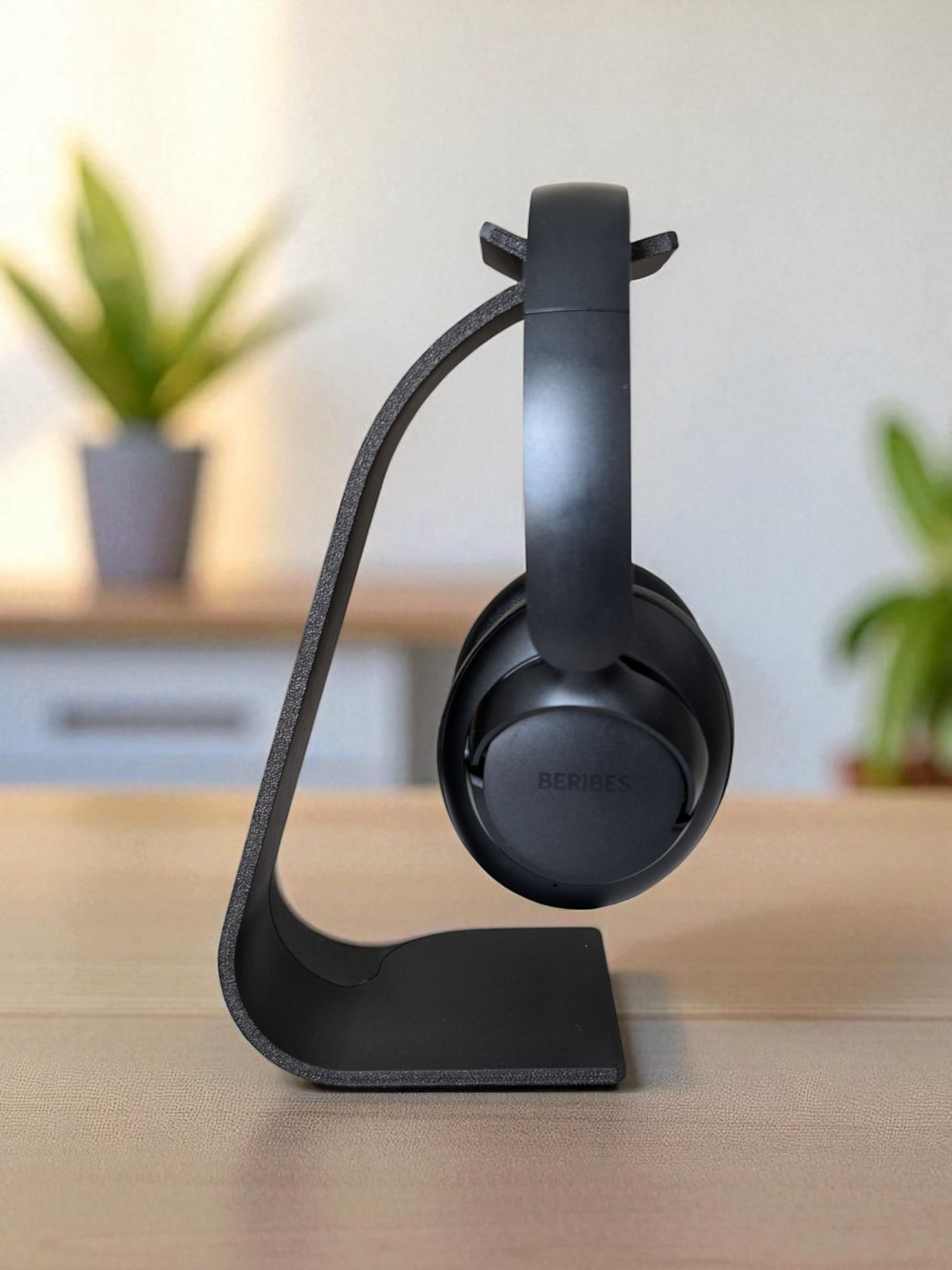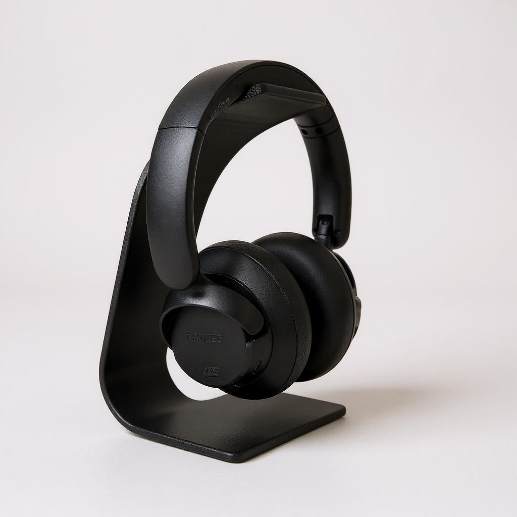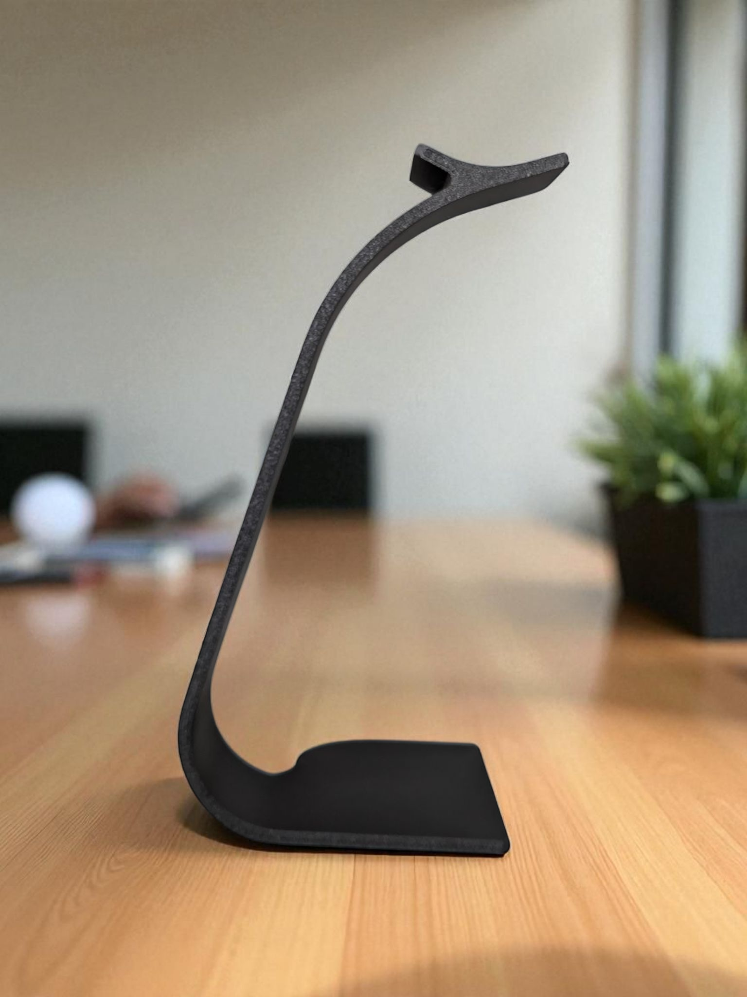 Stojak „Swing” to prawdziwa definicja fluid design. Jego unikalny, łukowaty kształt, wykonany w głębokiej, matowej czerni, imituje ruch i lekkość, doskonale kontrastując z geometrycznym porządkiem biurka. Idealnie sprawdzi się zarówno w nowoczesnym biurze domowym, jak i jako elegancki dodatek do studia nagrań. To akcesorium, które przemienia zwykłe przechowywanie w element dekoracyjny.