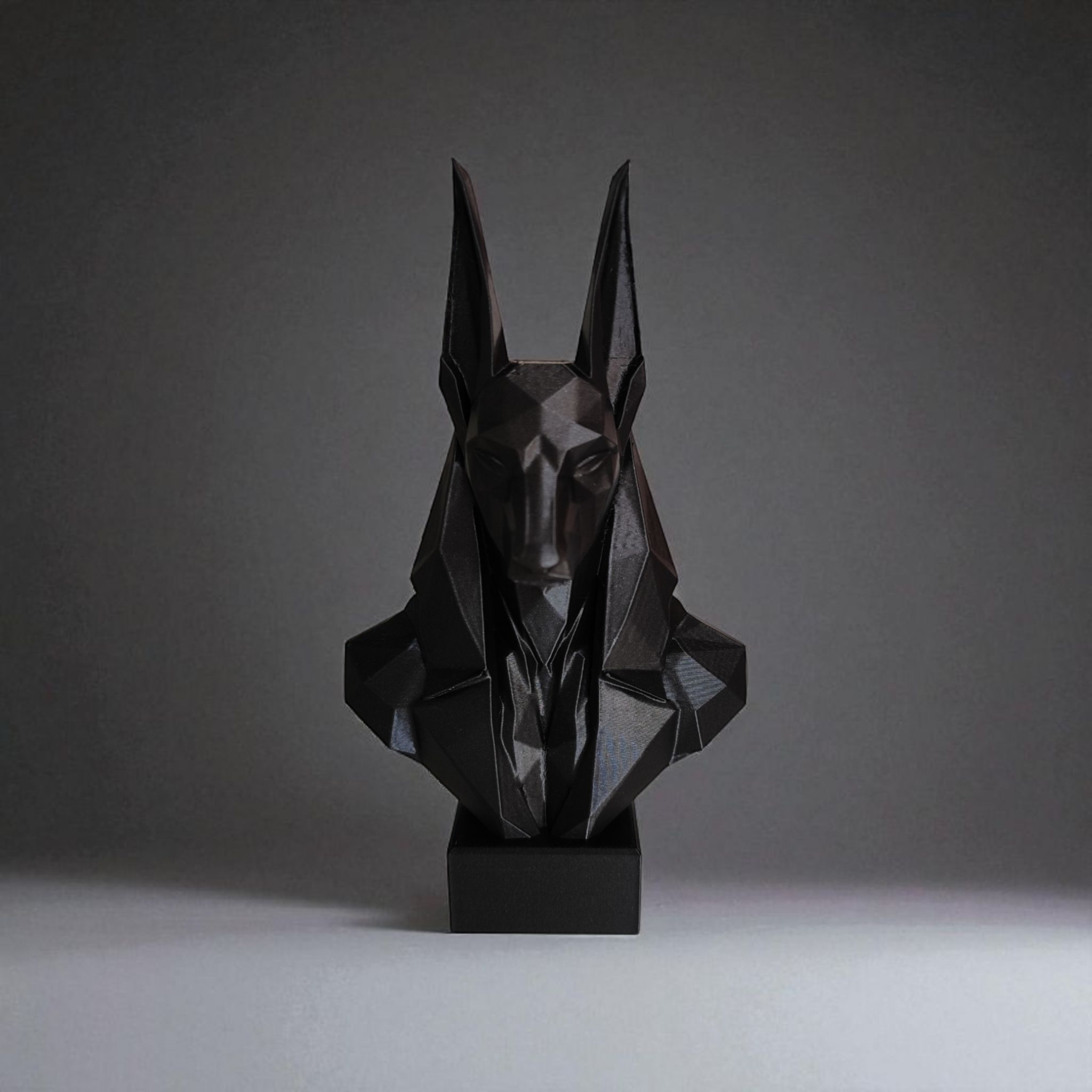 To hipnotyzujące popiersie jest wyjątkowym połączeniem klasycznego tematu i nowoczesnego wykonania. Wykorzystanie techniki Low Poly nadaje Anubisowi, bogu zaświatów, ostry, fasetowany kształt, który łapie światło, tworząc dynamiczne cienie. Solidna, prosta podstawa tylko wzmacnia jego monumentalny charakter.