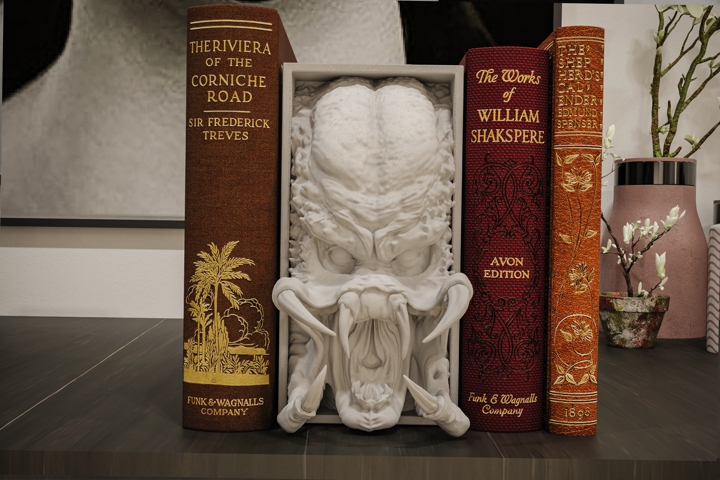 Każdy tom stojący przy tej podpórce nabiera ciężaru starożytnej kroniki o krwawym kodeksie, jakby był reliktem z niezliczonych polowań. To nie jest zwykły przedmiot – to Predator w swojej najbardziej brutalnej i biologicznej chwale. Podpórka nie tylko utrzymuje Twoje książki w ryzach, ale robi to z pierwotną grozą, przypominającą o tym, że nawet na najbezpieczniejszej półce czyha doskonały łowca.
