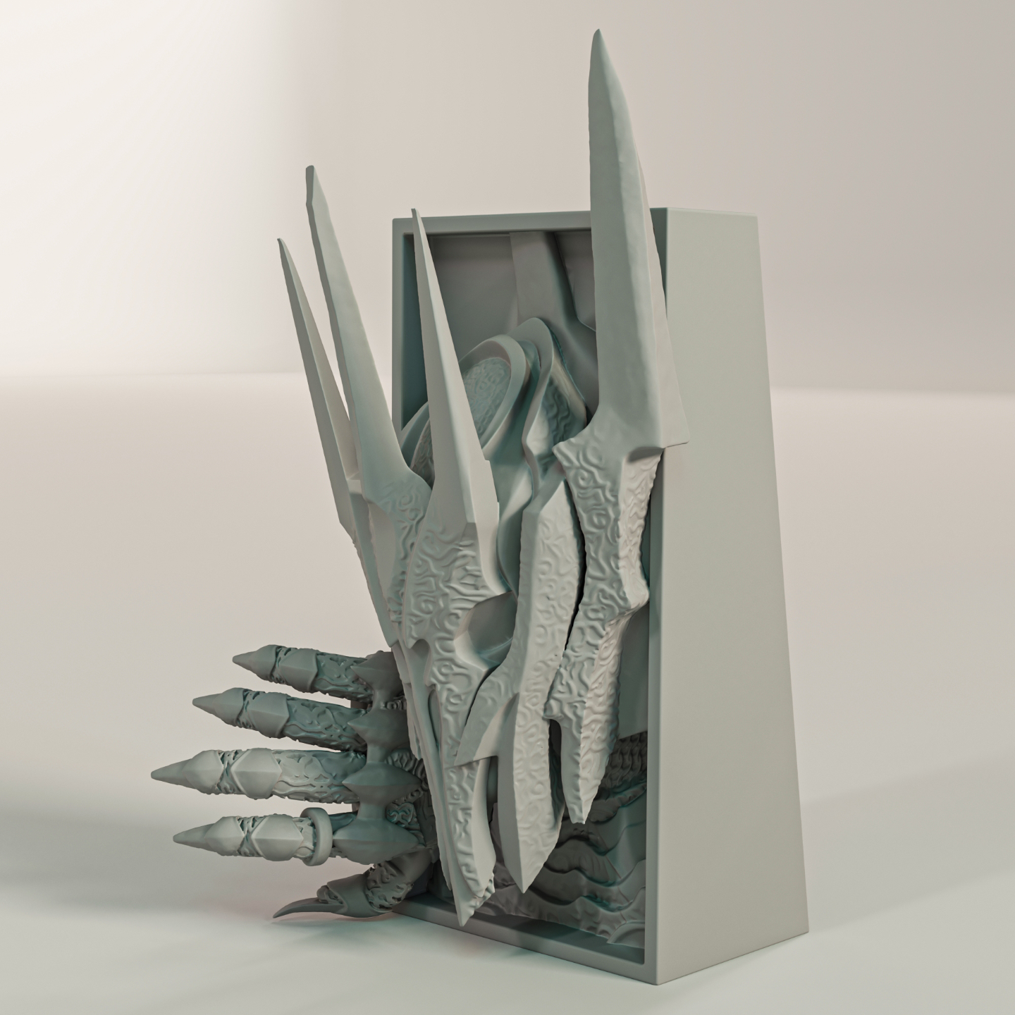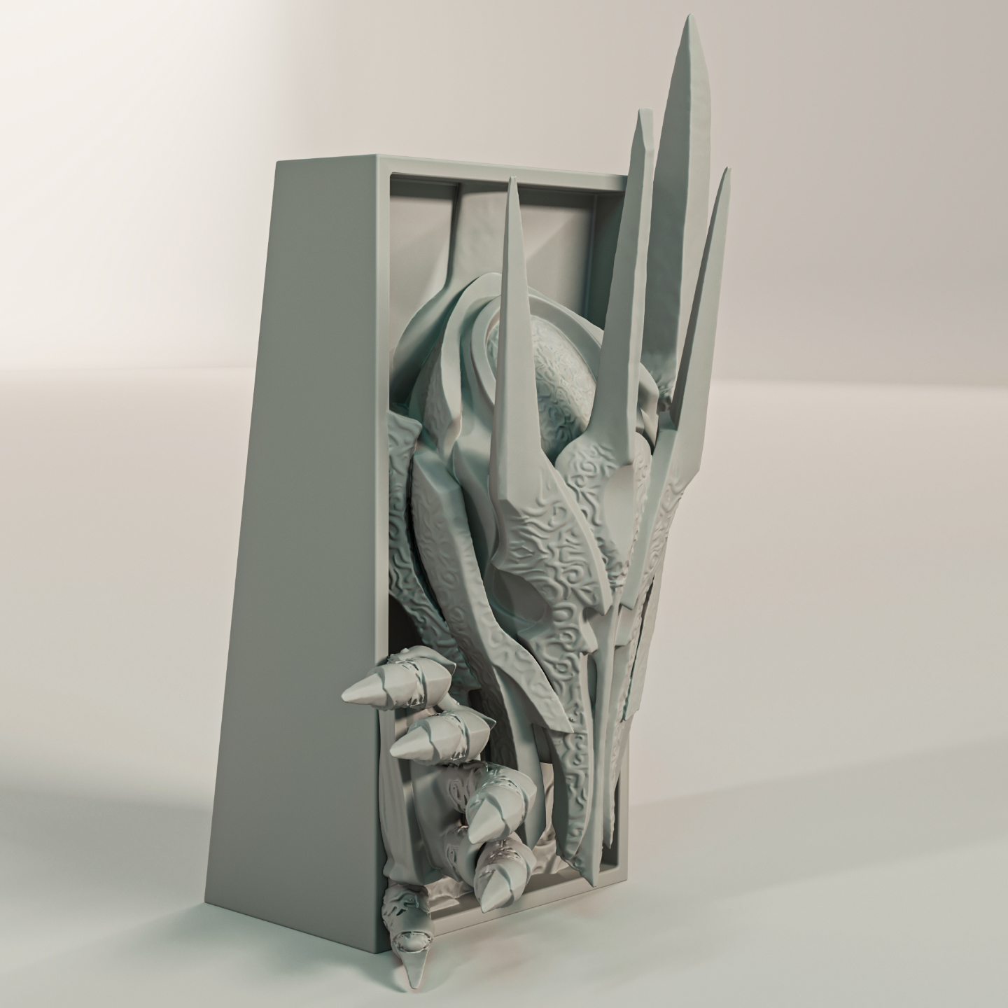 W tej monumentalnej podpórce jego hełm został oddany jako korona tyranii i zniszczenia: poszarpane, kolczaste korony metalu wyrastają ku górze niczym zastygłe, czarne płomienie, a jego powierzchnię pokrywają skomplikowane, złowrogie runy. W tle hełmu majaczy Oko Saurona, symbol wszechwiedzącej, palącej czujności. Z boku kompozycji wyłania się żelazna rękawica, jej zębate, masywne palce zdają się sięgać po Twoje tomy – to ucieleśnienie Pięści, która zniszczyła Ostatni Sojusz.