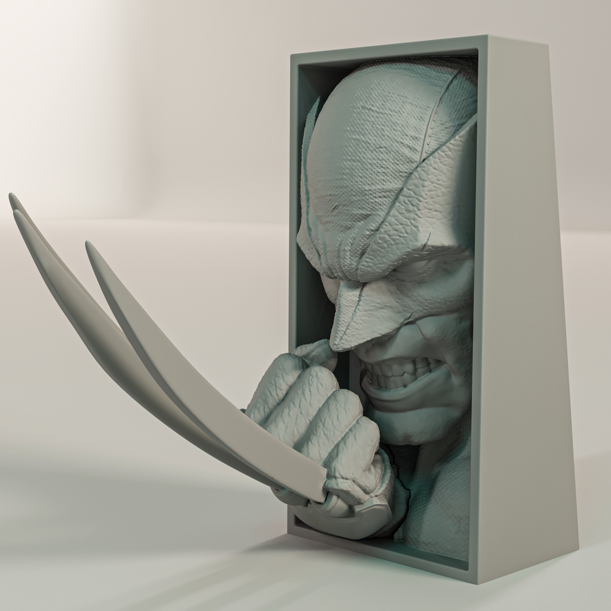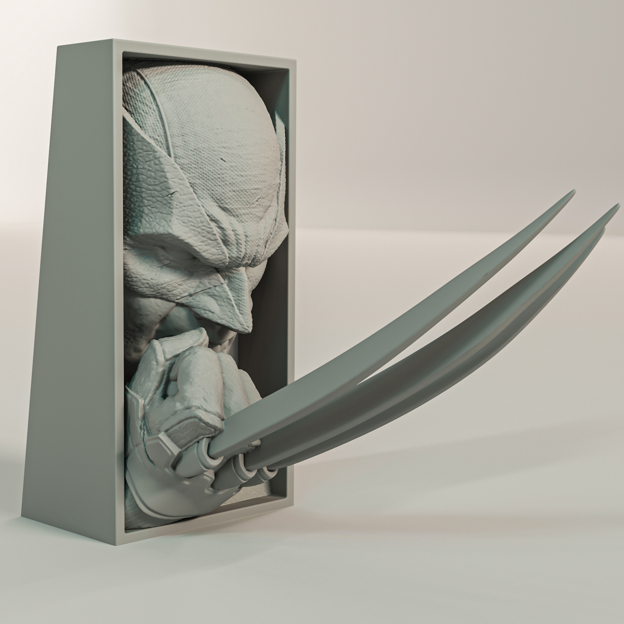 W tej monumentalnej podpórce do książek, ujętej w formie dynamicznej płaskorzeźby, uchwycono chwilę przed uderzeniem: jego ikoniczna maska z wysuniętymi „uszami” jest skrzywiona w wyrazie czystej, niepohamowanej furii. Uwagę kradnie pięść wysunięta w pierwszym planie, z której w agresywnym geście wystrzeliły trzy kolce czystego Adamantium. Pazury są ostre i lśniące, tworząc nieprzekraczalną barierę na granicy Twojej kolekcji. To uosobienie dzikości i niezniszczalności.